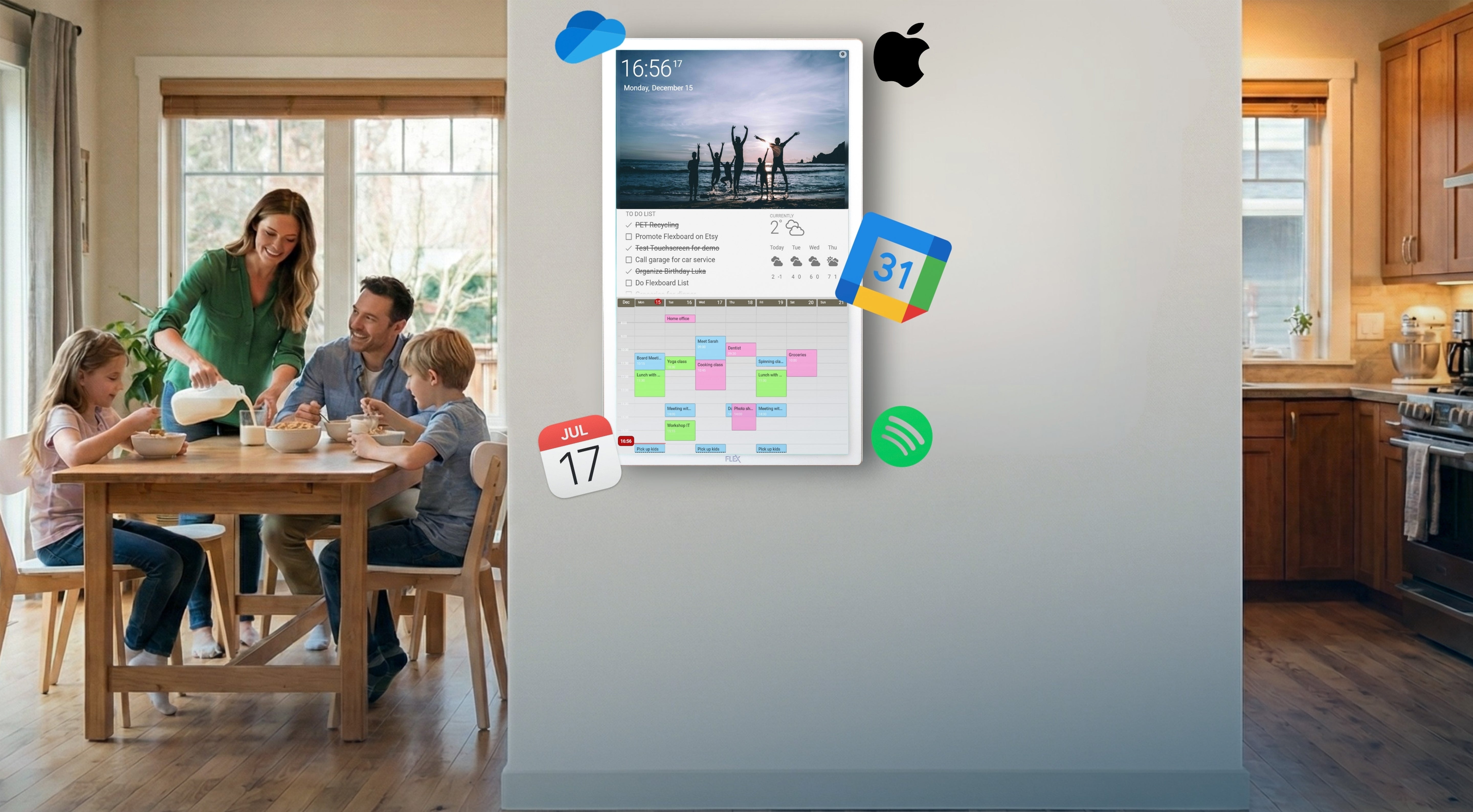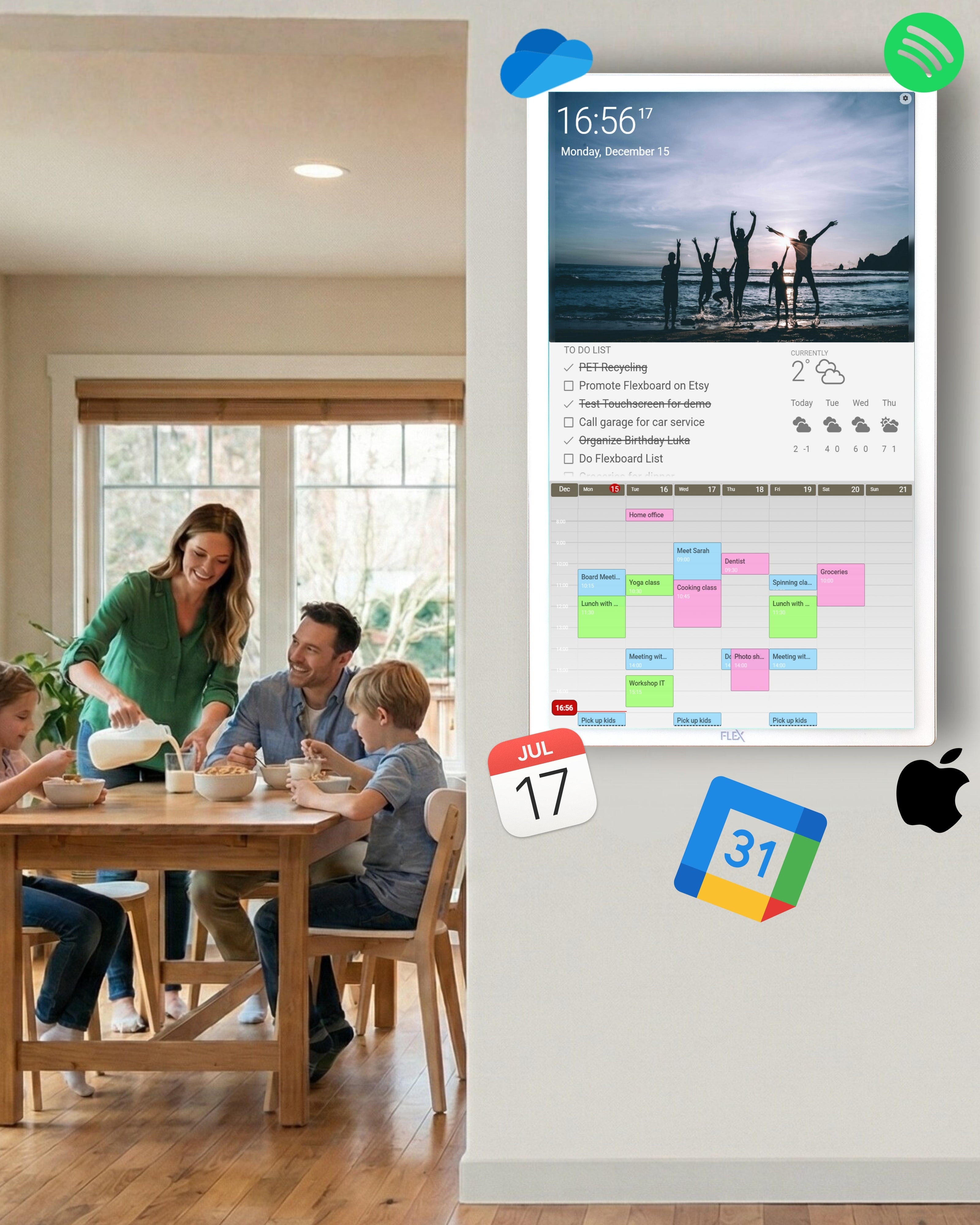 Flexboard connects to your existing cloud services like Google calendars, Microsoft to-do lists, weather, Dropbox photos, and more. It simply brings all your key information together in one elegant touchscreen.
